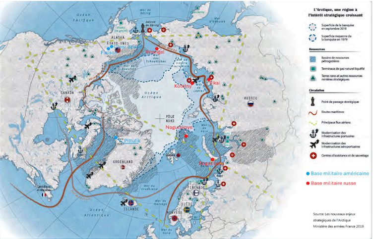Les prétentions américaines visent également à contrecarrer la suprématie chinoise sur le marché des terres rares et à éviter que le Groenland ne tombe dans la zone de contrôle russe ou chinoise. Depuis le milieu des années 2010, la Russie a accru ses efforts pour asseoir sa domination militaire dans l’Arctique. Elle a installé de nouvelles bases militaires, ou en a réhabilité d’anciennes.