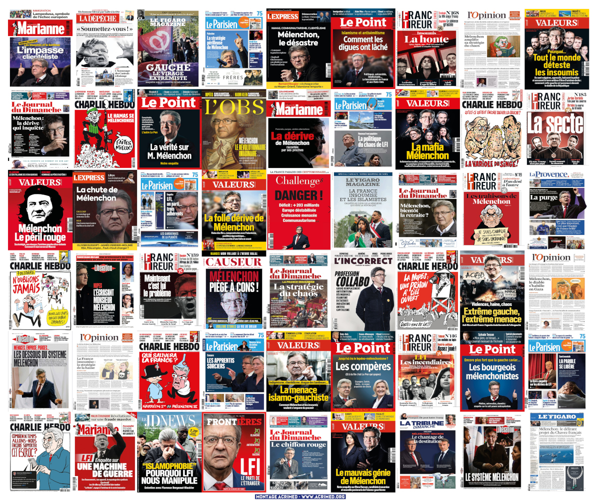 Loin d’être exhaustif – par souci de lisibilité, nous n’avons par exemple pas inclus les couvertures de puissants quotidiens tels que Le Figaro (sauf une), Les Échos ou Le Monde – ce paysage de Unes donne néanmoins un aperçu du climat ambiant : près de 90% d’entre elles (48) sont parues post janvier 2022, et même post octobre 2023 pour plus de la moitié (55%). Il faut en outre se représenter la force de frappe décuplée du paysage audiovisuel, déclinant jour après jour les mêmes mots d’ordre, sur tous les tons et jusqu’à l’acharnement, notamment dans le cas de l’eurodéputée Rima Hassan et de Jean-Luc Mélenchon, ciblé depuis le début des années 2010. Ainsi la principale force de gauche partisane en France est-elle unanimement stigmatisée par les médias dominants – et une partie des indépendants –, comme ne l’est aucun autre parti dans le champ politique… et de (très) loin. Si LFI ne saurait être au-dessus de toute critique, qui peut prétendre qu’il n’en va pas là d’un dysfonctionnement démocratique de premier plan ?