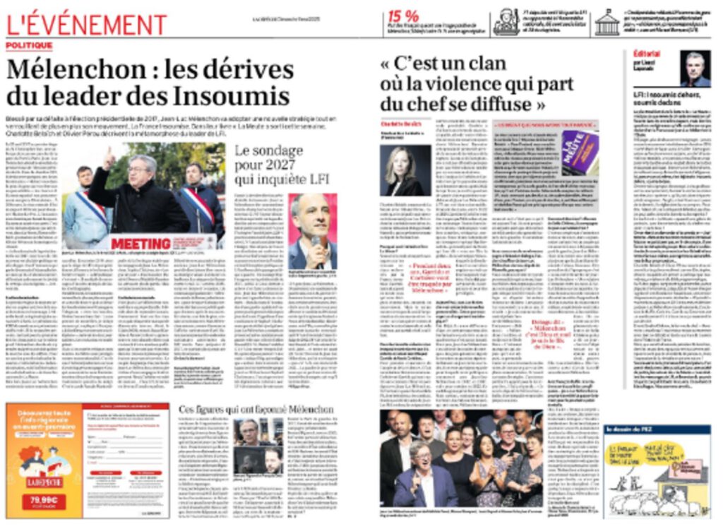 Depuis notre premier article, publié la veille de la parution du livre, les médias poursuivent donc leur matraquage et les deux auteurs leur tournée, investissant les dispositifs les plus indigents qui soient, dans des médias réputés pour leur engagement forcené dans la disqualification de la gauche. « Les Grandes Gueules » (RMC, 8/05), mais aussi « C à vous » (France 5, 9/05), où Anne-Élisabeth Lemoine exulte : « Votre livre s’arrache ! Il est en rupture de stock et il se vend d’ailleurs plus cher sur les sites d’occasion qu’en librairie ! » Tout en remplissant, à peu de frais cette fois-ci, les colonnes de Paris Match – « “Il a tout trahi” : comment Jean-Luc Mélenchon a éteint Les Lumières » (8/05) –, ainsi que de belles doubles pages entièrement à charge jusque dans la PQR.