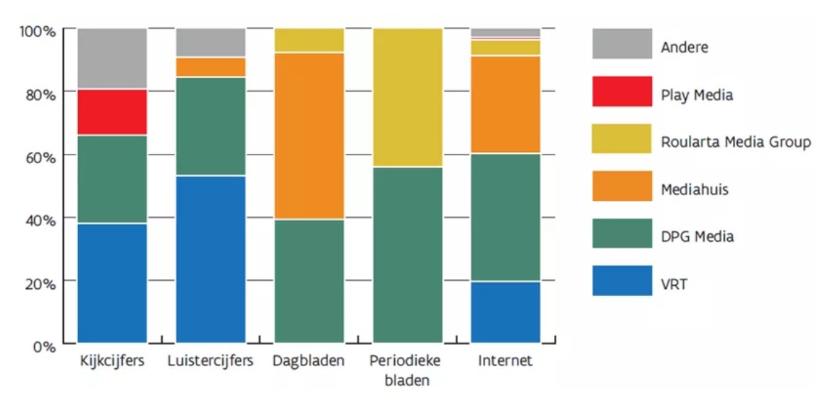 Tout ceci se déroule dans un contexte où cinq groupes contrôlent 80 à 100 % des produits médiatiques traditionnels. Il s’agit de VRT, DPG Media, Mediahuis, Roularta et Play Media. [1]