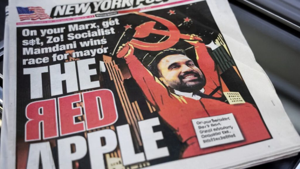 « Même le très démocrate “New York Times” a publié des articles peu flatteurs et n’a pas endossé sa candidature », résume sobrement Solveig Godeluck dans Les Échos (3/11), qui rappelle que le tabloïd de Rupert Murdoch The New York Post « a appelé à voter contre “le socialiste radical, antisémite” » et « a pilonné le candidat avec des couvertures ». Le jour de la victoire du candidat socialiste, le tabloïd ne s’est d’ailleurs pas embarrassé de subtilités et a titré « The Red Apple », en plaçant une faucille et un marteau entre les mains de Zohran Mamdani dans un montage grossier.