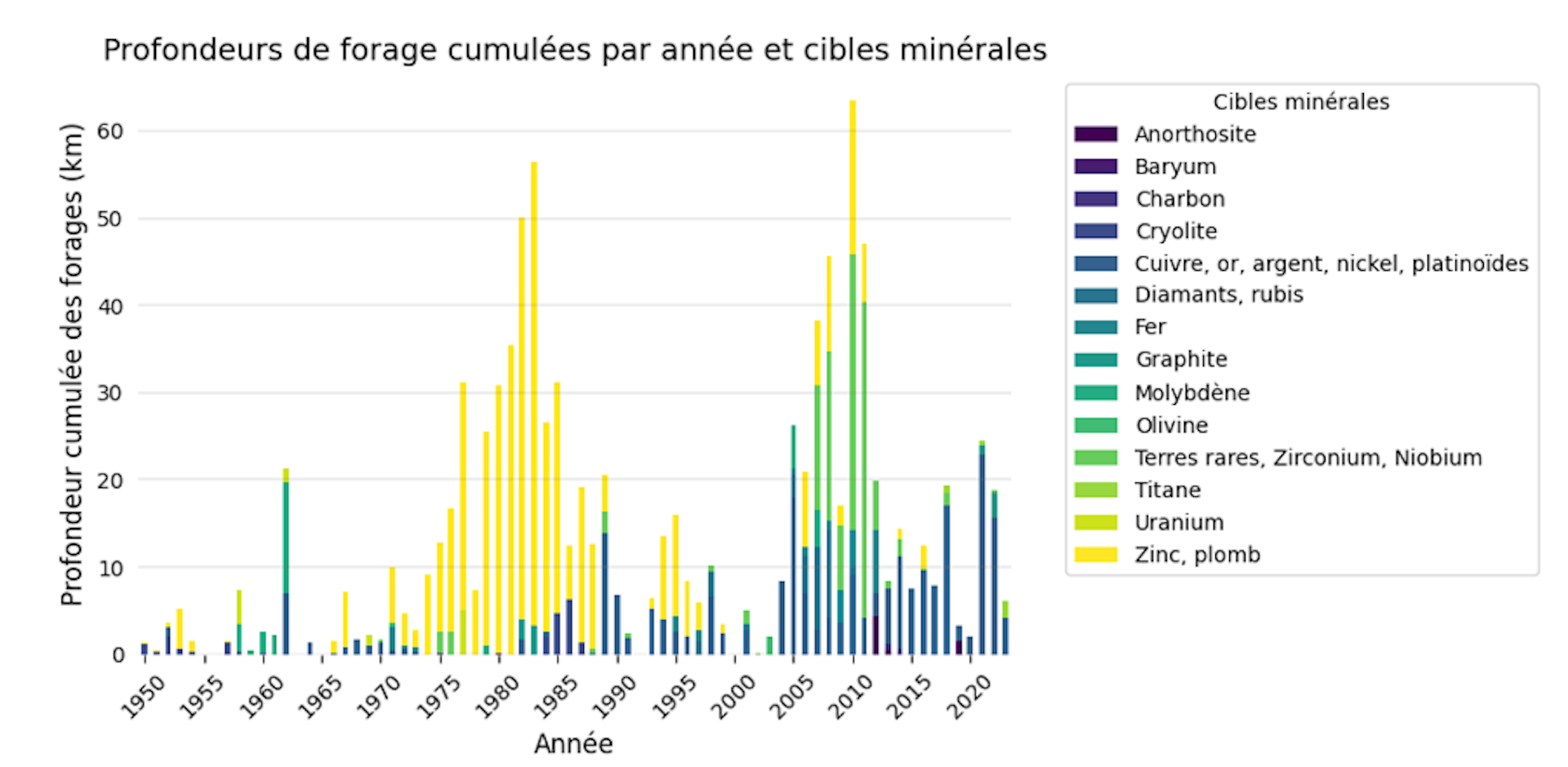 Figure 2 : Évolution des forages exploratoires au Groenland par type de métal, 1950-2023