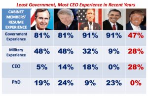 Trump choisit son équipage (voir fin d’article) en fonction de deux critères: la capacité de gagner et l’indépendance. Résultat: on trouve des gens âgés, très fortunés, sans vergogne et «libres», c’est-à-dire capables de dire non à toute sollicitation. Capitaliste, Trump semble vouloir conduire son pays non selon un schéma politique savamment tramé mais comme un chef d’entreprise, capable de décider en fonction de l’appréciation immédiate de telle ou telle situation. L’immédiateté va rejoindre la vulgarité et l’esprit de combat. Et les Nord-Américains aiment ça. Quand un dirigeant est à la fois martial, chaud et imprévisible, il faut s’attendre à tout. On risque de confondre les pinceaux dans la lecture du jeu.