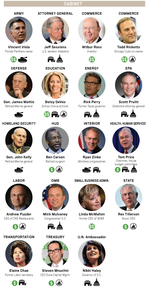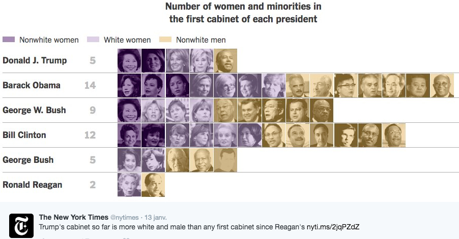 Les PME seront orientées par une cheffe d’entreprise qui organise des matchs de catch. On attend de nouvelle règles! Rien de tel qu’un proche des entreprises des énergies fossiles pour s’occuper de l’environnement. Et rien de tel qu’un homme du sérail (Goldman Sachs) pour être en charge du Trésor. Il n’y a pas mieux qu’un raciste pour le département de la Justice. «Je pensais que ces gars (le Ku Klux Klan, ndlr) étaient corrects jusqu’à ce que j’apprenne qu’ils fumaient de la marijuana.» a déclaré Jef Sessions, nouveau ministre de la Justice. Pour le contrôle de la Bourse, le choix s’est porté sur un avocat d’affaires, spécialisé dans les fusions-acquisitions.