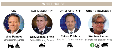 L’équipe à responsabilités politiques identifiées (devant le Parlement notamment) ne fera pas oublier le rôle de Steve Bannon. L’homme a déjà été décrit dans les colonnes de POUR. Il a le couteau entre les dents et est prêt à broyer du Noir, du féministe, du féminin, du démocrate, du dérangeant et du non-aligné. C’est le genre de personnage qui aurait parfaitement convenu dans le dispositif maccarthyste. Il construit des dossiers…