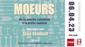 Posté dans Économie, Featured, Femmes, SociétéCe 6 avril 2023, nous rencontrons Alain Deneault sur son dernier ouvrage “MOEURS De la gauche cannibale à la droite vandale”. Pour des raisons environnementales […]
