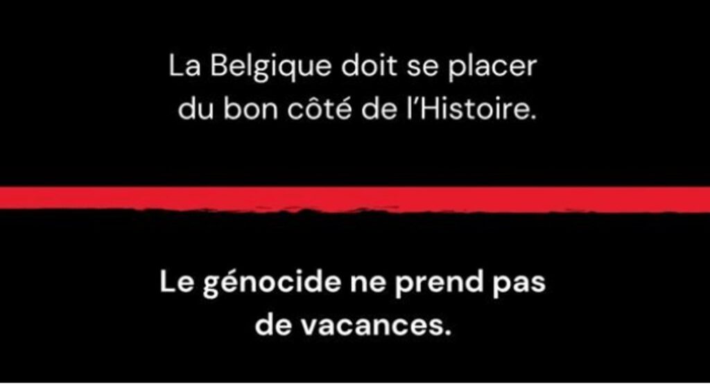 Nous adressons solennellement aux dirigeants de Vooruit, du CD&V et des Engagés la demande de passer aux actes sans aucun délai. Qu’il y ait dans leur gouvernement deux partis qui nient le génocide en cours, ce n’est pas notre choix : c’est le leur. Si ces trois partis ne considèrent pas que l’urgence des multiples alertes de famine mérite d’en faire une question de gouvernement, que leur faut-il ? La destruction totale de tout ce qui fonde une société, infrastructures, systèmes d’éducation, de santé, d’alimentation, en vue d’un jour vider le territoire de ses habitants, tout cela constituant un processus de génocide, est-ce pour eux un détail ? ou un simple objet de communication publicitaire ?