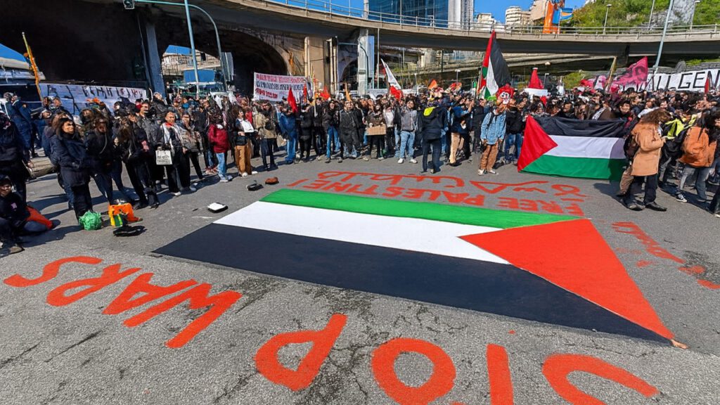 La grève traditionnelle a été rejointe par une force considérable qui a paralysé les villes à tous leurs principaux carrefours. Si l’on peut parler d’une lutte et d’une unité généralisées entre le monde du travail « traditionnel » et celui de l’emploi précaire, cela a été évident le 22. Non seulement dans les grandes villes, mais aussi dans les plus petites. Ce succès, que même les médias n’ont pas pu occulter, signifie que la mobilisation est déjà large et généralisée, avec une forte présence de slogans radicaux, et non minoritaires. Il est indispensable de l’élargir. Cela peut se faire, à mon avis, en recherchant la convergence la plus large possible, en unissant et en évitant de créer des conflits entre ceux qui agissent pour des raisons purement éthiques et humanitaires et ceux qui comprennent que la mobilisation est aussi et avant tout politique. Un réseau de coordination existe déjà pour les connexions avec les autres ports italiens, que l’USB a commencé à construire il y a au moins deux ans. Ce réseau se développe à l’international, notamment avec l’aide de la Fédération syndicale mondiale, dont l’USB est membre fondateur. Si aujourd’hui les ports sont bloqués non seulement à Gênes, mais aussi à Livourne, Ravenne, Tarente, etc., le mérite en revient aux grévistes, mais aussi à l’idée de coordination organisationnelle. Aujourd’hui même (27 septembre 2025), une réunion opérationnelle se tient à Gênes avec les travailleurs des ports européens et au-delà. La coordination internationale existe déjà, mais nous pensons qu’elle devrait être élargie et davantage structurée.