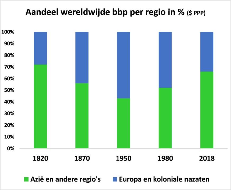 Au regard de l’histoire, cela n’a rien d’anormal. Pendant des siècles, le centre de gravité de l’économie mondiale s’est situé en Asie. Suite à la colonisation par l’Occident et à l’industrialisation exclusive de ce dernier, cet équilibre mondial a été temporairement bouleversé. Il s’agissait toutefois d’une exception historique. Comme le montre le graphique, nous assistons aujourd’hui à un mouvement de rattrapage.[2]