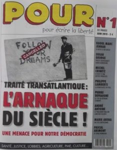 A la sortie du premier numéro, bien des lecteurs ont cru d’emblée à la renaissance de POUR, hebdo de gauche fondé en 1973 et disparu en 1982 à la suite d’un attentat. L’équipe qui a réalisé ce numéro n’avait pas ce projet à l’époque, elle était entièrement concentrée sur l’action à mener pour contrer les traités transatlantiques.