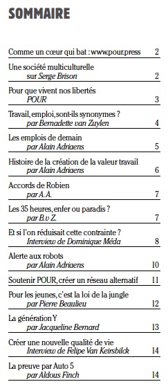 Le nouveau journal POUR est mis en vente ce mercredi 24 mai 2017, au prix de 3€, en Belgique et en France. Imprimé à 151.400 exemplaires et présent chez plus de 18.800 marchands de journaux, il offre au lecteur une réflexion, une analyse et des propositions sur le thème «Réinventer notre rapport au travail».