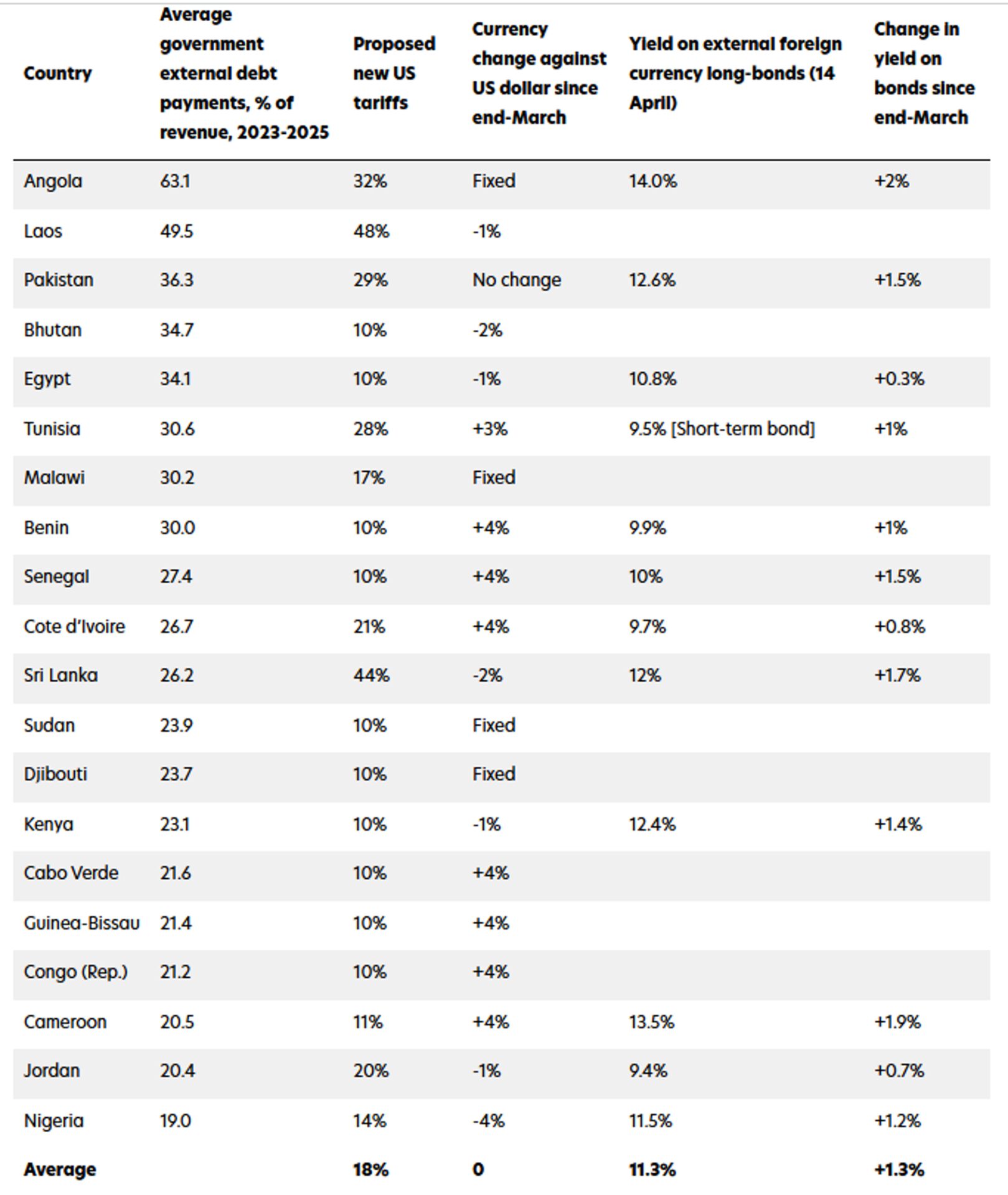 Pays Paiements moyens de la dette extérieure publique, en % des recettes, 2023-2025 Nouveaux droits de douane proposés par les États-Unis Variation de la devise par rapport au dollar américain depuis fin mars Rendement des obligations étrangères à long terme en devises étrangères (14 avril) Variation du rendement des obligations depuis fin mars