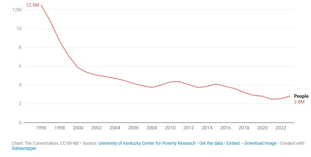 Après la création du programme d’aide temporaire aux familles dans le besoin, qui a remplacé le programme d’aide aux familles avec enfants à charge, le nombre d’Américains inscrits au programme d’aide sociale en espèces a fortement diminué. Ce nombre a ensuite progressivement baissé, avant de connaître une légère reprise ces dernières années.