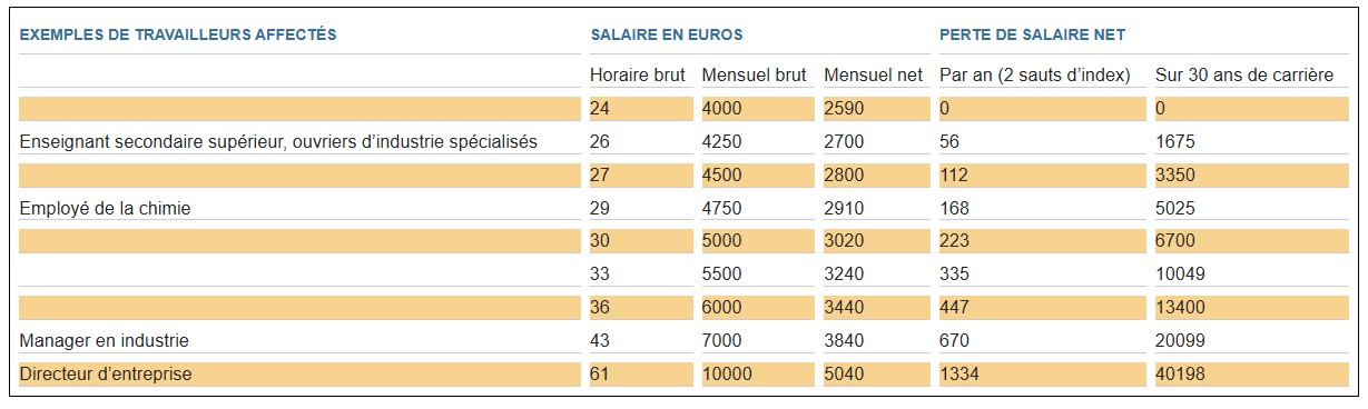 Le seuil de 4000 euros est pour un salaire à temps plein. Pour calculer l’impact financier sur un temps partiel, il faut proratiser le salaire de ce dernier. Par exemple, un travailleur à mi-temps gagnant 2500 € brut par mois est en fait à un salaire à 5000 € brut par mois à temps plein. Il sera donc affecté par le saut d’index.