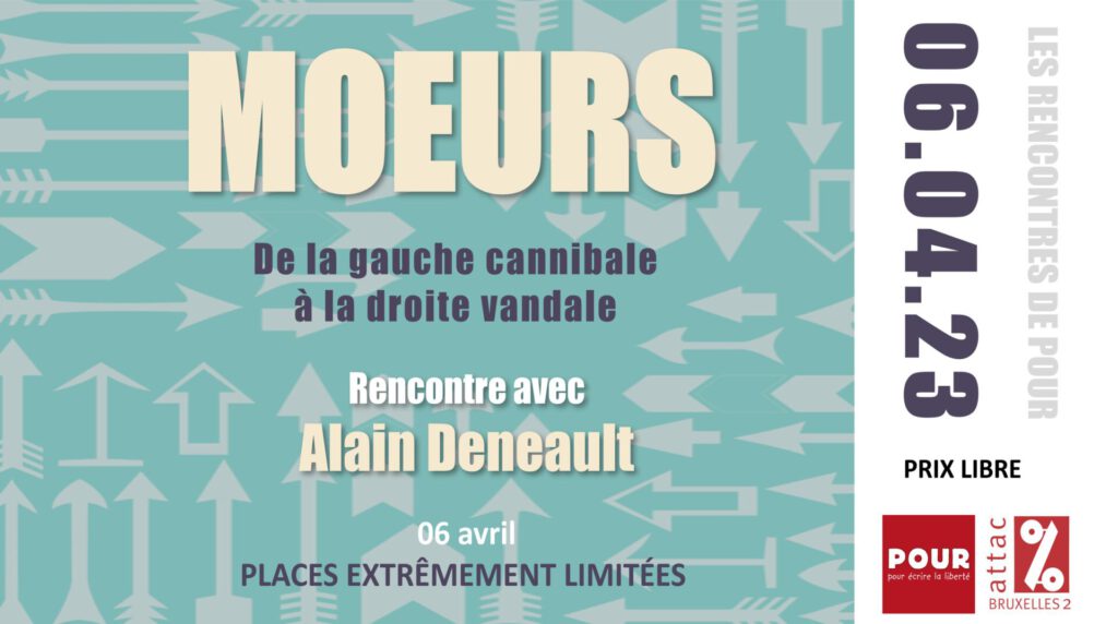 Pour des raisons environnementales et climatiques, Alain Deneault, qui habite au Canada, ne viendra pas en Europe. Nous ferons donc cette rencontre à distance, via Zoom. Les conditions techniques seront mises en place pour avoir une bonne qualité vidéo (pour diffuser ensuite le message au plus grand nombre).